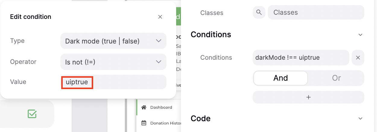 When using a Dark mode condition, it wasn’t working with the value of “true“, so I searched the UiPress source code and found “uiptrue”, which works. That seems like a confusing bug.