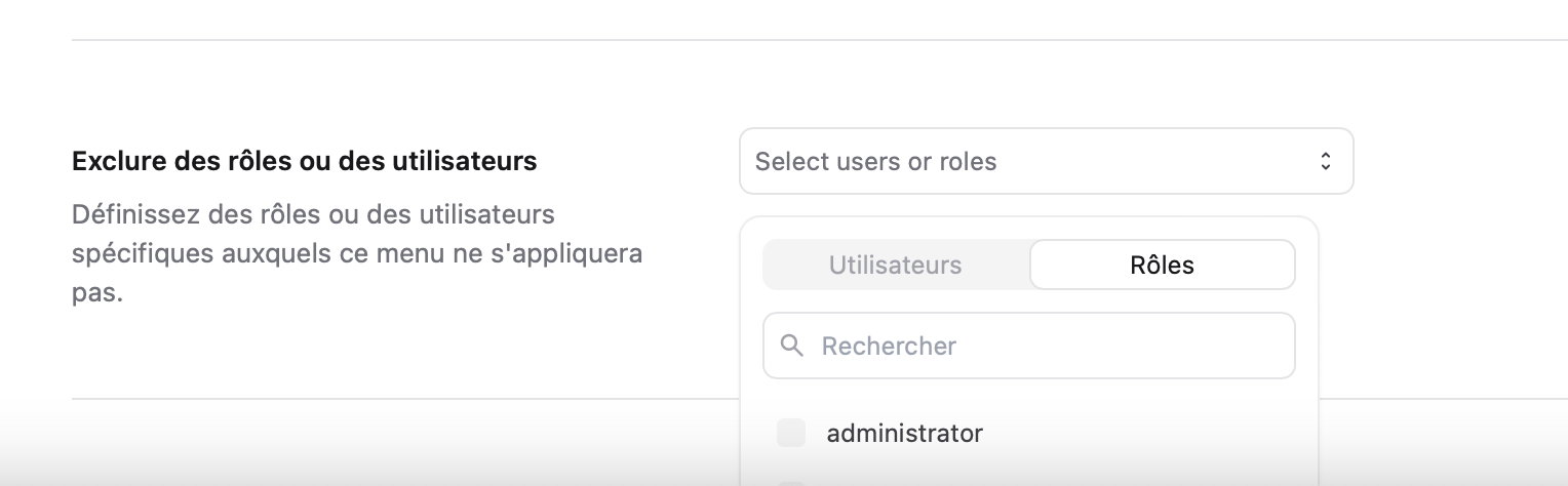 I found another little UI bug with the menus creator. The window which allow us to exclude users appear out-of-screen, but only on the first click. On the second click, the window of the option appear normally.